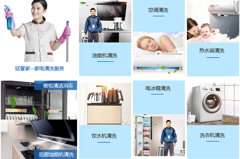 廷管家服務(wù)項目包含油煙機清洗、空調(diào)清洗、熱水器清洗、飲水機清洗等多項家電清洗業(yè)務(wù),安全便捷又放心!