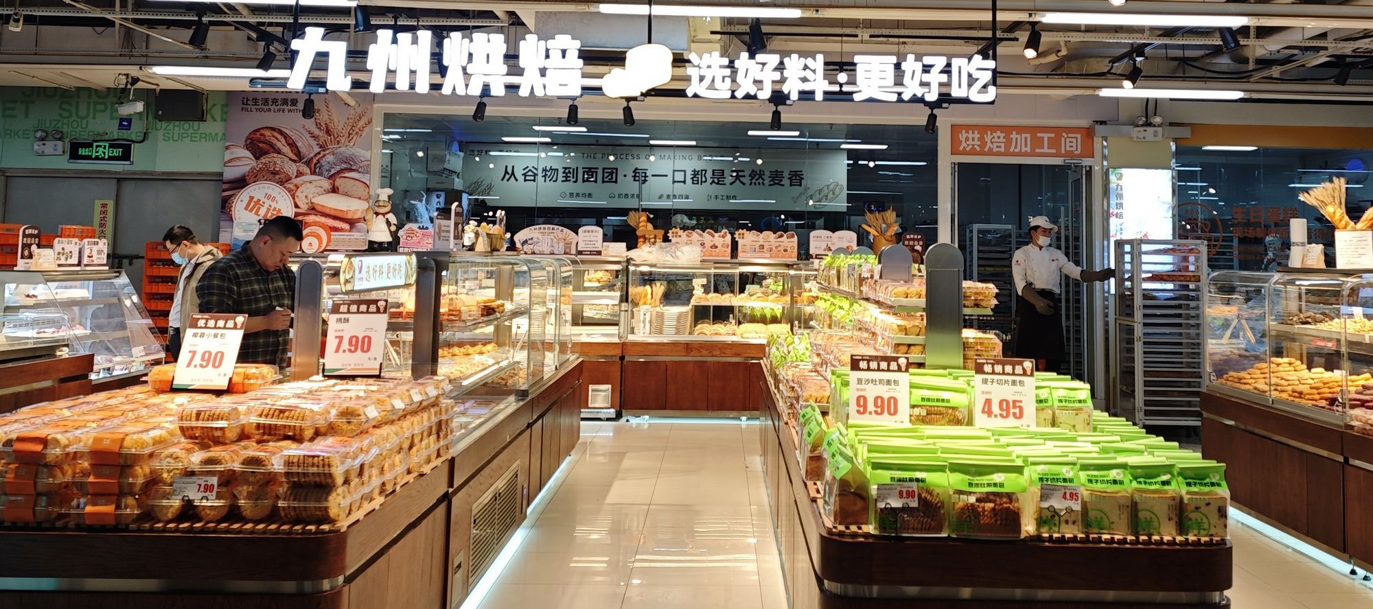 為讓更多的顧客享受到九州烘焙系列產(chǎn)品,感受美好“食”光,超市公司決定開設(shè)自營烘焙面包店。九州烘焙東華花園店位于臨沂市沂河新區(qū)香港路與沂河路交匯九州超市內(nèi),經(jīng)營面積70余平方米。開業(yè)當(dāng)天,店內(nèi)各式面包糕點(diǎn)種類豐富,現(xiàn)場加工類產(chǎn)品60余種,包括裱花生日蛋糕在內(nèi)的糕點(diǎn)類產(chǎn)品40余種,從現(xiàn)烤類肉松卷、豬扒包、奧利奧可可、芝士肉松包、核桃馬里奧到吐司類雜糧吐司、紅豆吐司再到披薩類、三明治類,商品豐富多樣,能有效滿足家庭早餐、下午茶、兒童零食等多場景需求。店內(nèi)所有產(chǎn)品使用優(yōu)質(zhì)原材料,堅(jiān)持天然無添加;現(xiàn)烤熱賣產(chǎn)品當(dāng)天現(xiàn)烤現(xiàn)賣,當(dāng)日出清,確保新鮮健康。